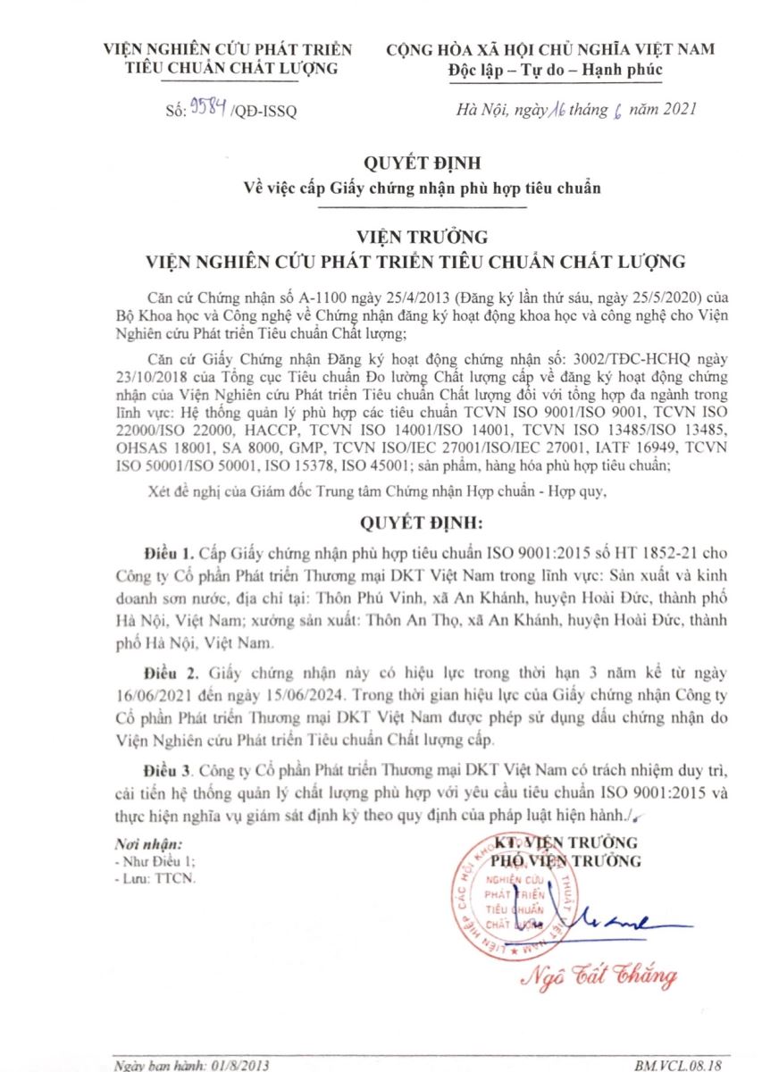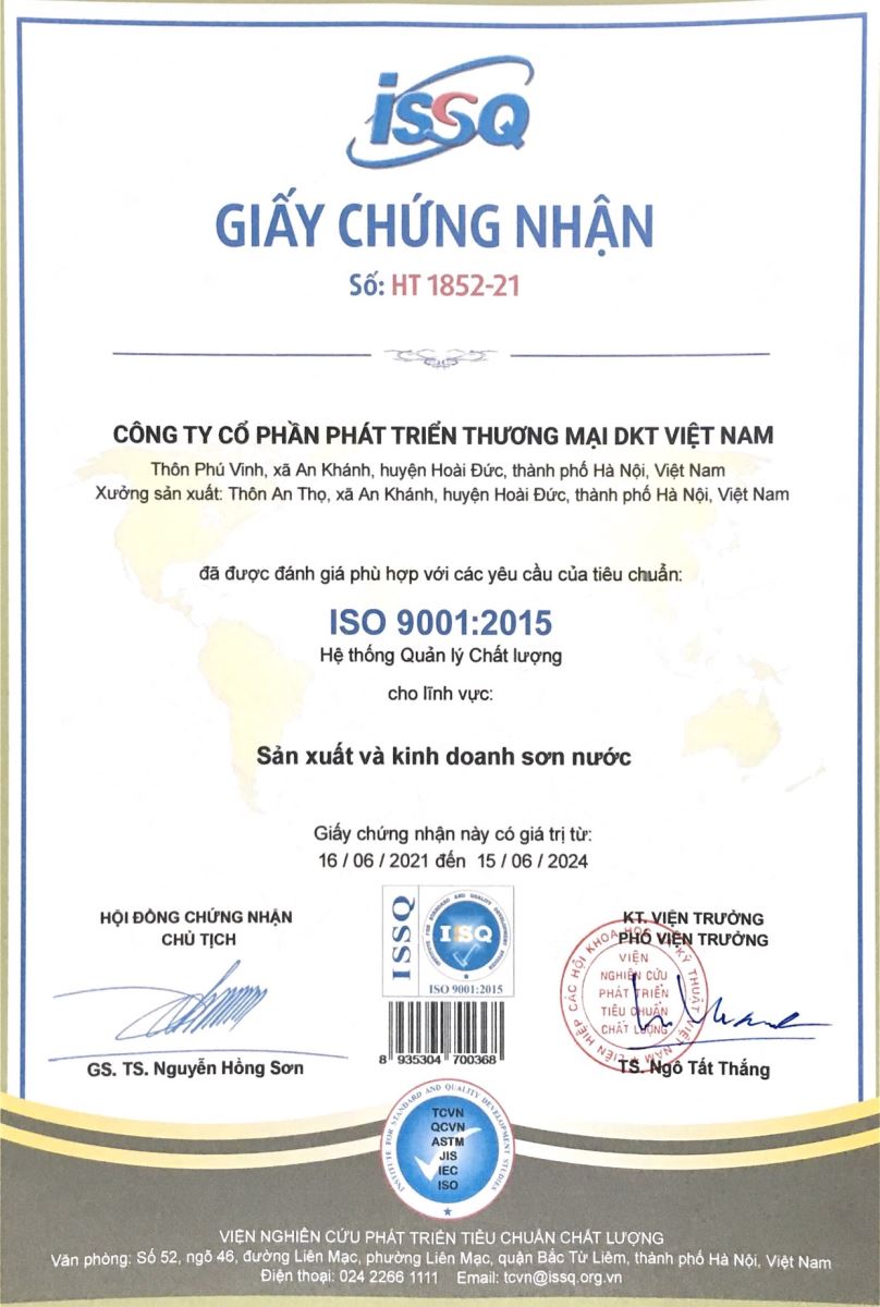 Với định hướng phát triển chú trọng vào chất lượng sản phẩm nhằm mang đến cho người tiêu dùng những sản phẩm sơn cao cấp chất lượng tốt, Công ty Cổ phần Phát triển thương mại DKT Việt Nam đã triển khai xây dựng và áp dụng thành công Hệ thống Quản lý Chất lượng Quốc tế ISO 9001:2015. Hệ thống này sẽ giúp Công ty nâng cao hiệu quả quản lý, làm tăng sức cạnh tranh cũng như tạo uy tín đối với các đối tác và khách hàng.